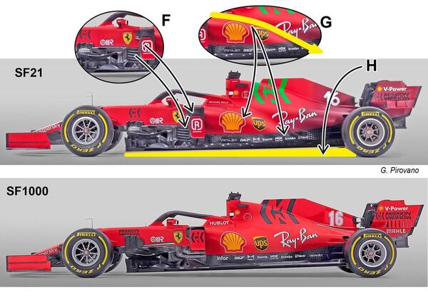 Le pance (G) sono molto diverse dalle precedenti. Ora scendono in maniera molto più accentuata al posteriore come su tutte le altre monoposto. Una soluzione, questa, pensata per migliorare i flussi aria che vanno verso il posteriore e sullo scivolo posteriore. L'effetto rake (H) sembra essere stato ridotto. L'altezza da terra al posteriore appare più bassa rispetto alla versione 2020. Queste sono le novità più importanti che vediamo esternamente. Sotto la carrozzeria, invece sono inediti la conformazione degli scarichi, la scatola del cambio ora più stretta e il motore potenziato e con più cavalli.