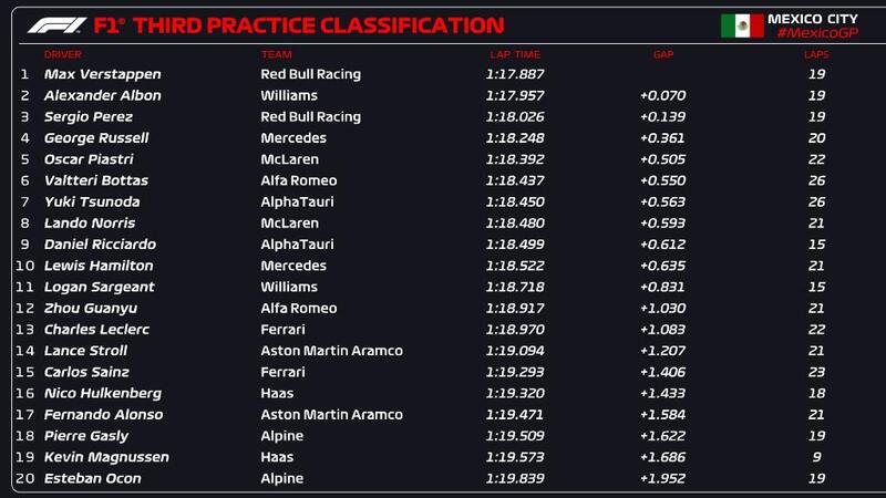 Allo scattare del semaforo verde, i piloti hanno tardato a scendere in pista per sfruttare al meglio quelle che saranno le migliori prestazioni che si avranno man man che il tracciato di Città del Messico si andrà a gommare. Il primo a tentare il colpo è stato Valtteri Bottas, che nelle precedenti sessioni ha sorpreso con le sue ottime prestazioni. La Ferrari si è concentrata principalmente sulla simulazione qualifica, come tutti i top team, compresa Red Bull che è scesa per ultima in pista. Questo permetterà loro di preservare treni di gomme hard e medie in vista della gara. Molti piloti si sono lamentati per la mancanza di grip per colpa della leggera pioggerella scesa nella giornata di ieri. Mentre la Red Bull era ferma ai box, George Russell ha registrato il miglior tempo, seguito dal compagno di squadra Lewis Hamilton e Charles Leclerc. Fuori dal podio virtuale Carlos Sainz, Lando Norris ed Oscar Piastri. Concludono la top ten Tsunoda, Ocon, Bottas e Zhou.