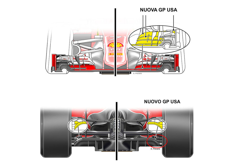 Ferrari, seconda forza del Mondiale, porta ad Austin una nuova ala anteriore, con flap mai visti sono ad ora sulla Rossa. Quelli superiori, ora hanno un nuovo disegno, mentre in passato erano uniti nella zona interna. Il flap principale è caratterizzato da un taglio a soffiaggio orizzontale molto più lungo, il quale si estende per tutta la lunghezza dell'ala. La paratia verticale, poi, presenta l'aggiunta di un'ulteriore appendice aerodinamica, la cui efficacia verrà valutata nelle prove libere, per comprendere se sia il caso o meno di utilizzarla in qualifica ed in gara. Al retrotreno della SF15-T, infine, abbiamo un nuovo disegno del diffusore, modificato nella parte esterna.