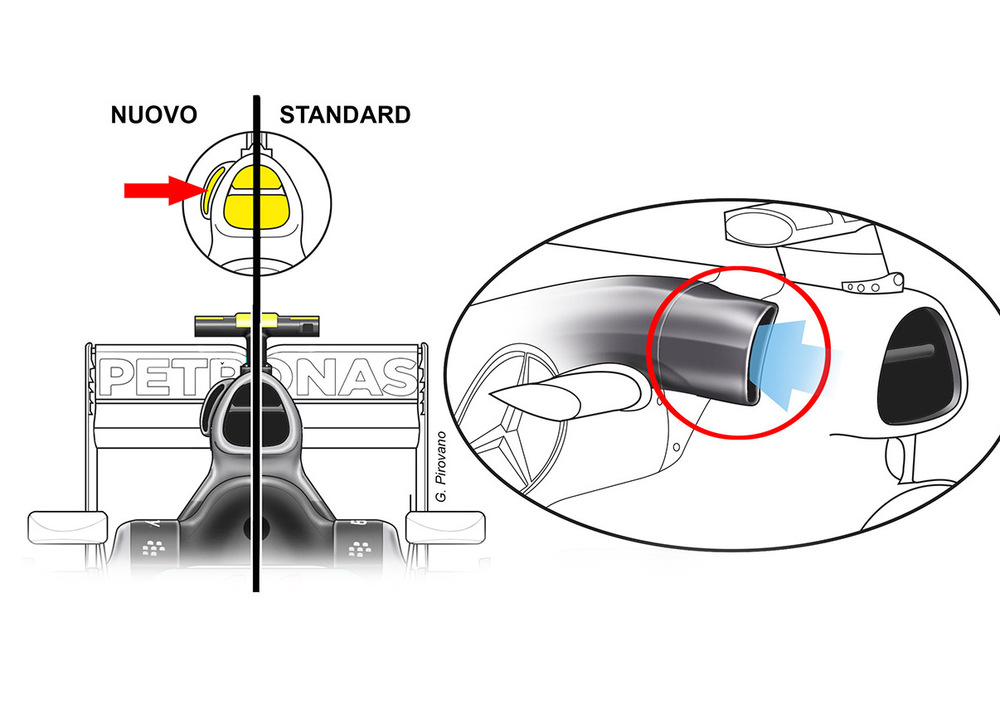 Nonostante si sia già guadagnata il suo secondo Titolo Mondiale e rischi seriamente di aggiudicarsi anche l'alloro tra i piloti in questo appuntamento, la Mercedes continua a portare innovazioni alle sue Frecce d'Argento. La F1 W06 di Nico Rosberg vanta una coppia di prese d'aria "ad orecchio" sul cofano motore, poste ai lati dell'air scope principale. Si tratta, verosimilmente, di un test in vista del Gran Premio del Messico, appuntamento che si svolgerà ad un'altitudine maggiore rispetto agli altri appuntamenti della stagione. per tal motivo, quindi, il fabbisogno d'aria per il propulsore aumenta. Se tale innovazione dovesse dimostrarsi funzionante, non sarebbe da stupirsi se dovesse essere riproposta anche per il GP del Brasile.
