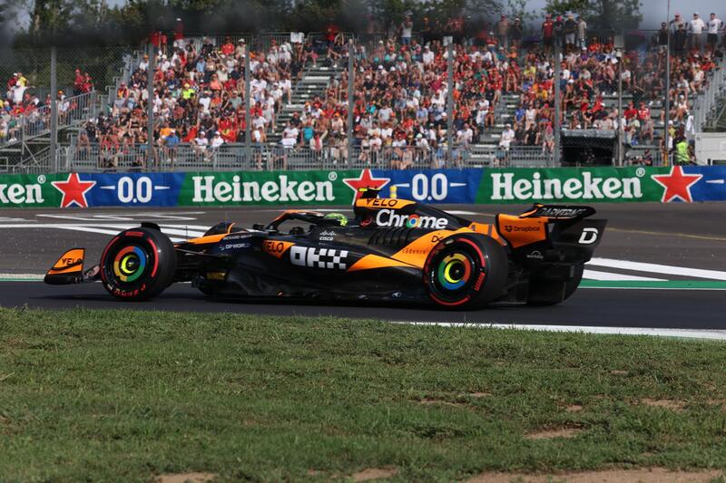 Allo spegnimento dei semafori del Gran Premio d’Italia Lando Norris ha avuto un ottimo spunto ma un leggero pattinamento ha permesso ad Oscar Piastri di prendere tutta la scia del compagno di squadra, superandolo. George Russell ha avuto un lungo alla prima variante recuperando molti danni alla sua Mercedes, mentre Charles Leclerc è riuscito a salire alle spalle della McLaren dell’australiano al passaggio in seconda variante, alla Roggia. Grazie al lungo di Russell, Max Verstappen ha recupero una posizione mettendosi alle spalle di Lewis Hamilton che occupa la quinta posizione; l’olandese ha poi avuto un ulteriore vantaggio grazie alla scelta di partire con la gomma dura a differenza dei suoi diretti avversari che hanno optato per la media.