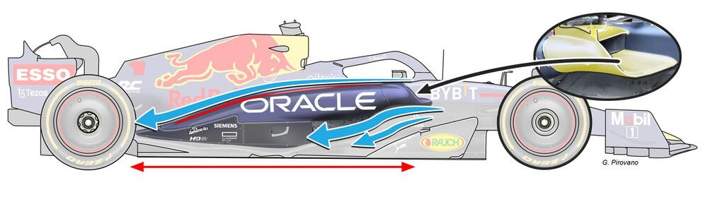 Come si evince dalla comparazione diretta tra le varie soluzioni, la Ferrari ha optato per una strada diversa, scegliendo pance alte e lunghe, con un'evidente scavatura nella zona inferiore sotto le bocche dei radiatori e, soprattutto, pensando a un disegno a onda per la zona superiore, a contatto con il telaio e il motore. La zona interna centrale è molto scavata. La Mercedes W13, invece, sfoggia pance cortissime, che scendono sciancrate repentinamente verso il fondo.