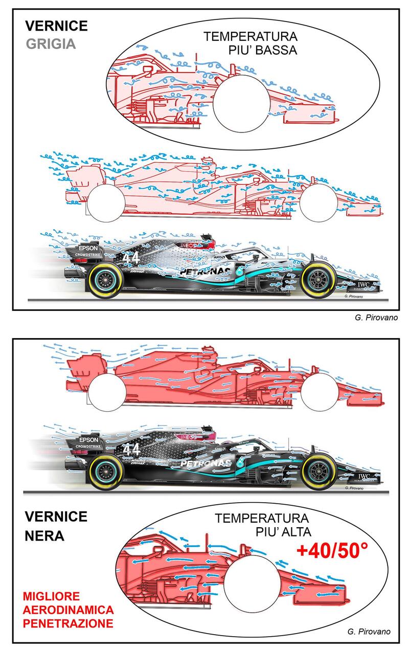 In pratica, usando il tipo di vernici speciali e la colorazione opaca, si ha un miglioramento del Cx che arriva allo 0,8 per cento, ovvero quasi un punto e la riduzione dell'attrito porta a un meno 10 per cento. Ecco perché dopo la Red Bull e la Ferrari, anche la Mercedes si è convertita alla colorazione diversa e per giunta con un nero che accumula calore, ma rende più fluida l'aria, quindi riducendo l'attrito e i micro vortici sulla carrozzeria migliorando la penetrazione aerodinamica. Qualcuno dice che abbiano migliorato di 1 punto di Cx, che a quelle velocità è davvero tanto. Quando si dice unire l'utile al dilettevole...