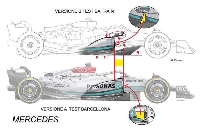 Entrando nel dettaglio, le pance Mercedes non sono sparite, ma sono state miniaturizzate in maniera incredibile. Sono state accorciate parecchio rispetto alla versione A di Barcellona: le linee rosse verticali nel disegno indicano dove iniziavano prima e dove si trovano ora. Questo cambiamento comporta lo spostamento del cono di antintrusione superiore al di fuori delle pance, andando ad incorporarlo in un profilo alare. Una soluzione, questa, che ha un chiaro scopo aerodinamico per convogliare l'area lungo le fiancate.