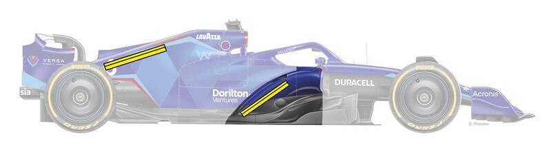 Le pance sono più basse e notevolmente ristrette nella zona iniziale. Lo si vede dalle bocche dei radiatori, che prima erano quasi squadrate e ora sono sottilissime e strettissime per allargarsi leggermente sul fondo. Zona in cui, peraltro, sparisce la zona a conchiglia, sostituita da soli due innalzamenti dal fondo. Ai lati del telaio trovano posto due deviatori di flusso per incanalare aria sul fondo verso la bocca aria del canale effetto suolo. L'intera zona delle pance diventa miniaturizzata, a tutto vantaggio aerodinamico. Si tratta di un'interpretazione più sofisticata della filosofia adottata dalla Williams, che vanta pance molto corte che vanno a spiovere in maniera repentina, ma non in maniera esasperata e corte come quelle della nuova Mercedes. La Williams, inoltre, adotta radiatori oltre che all’interno della pance anche sopra il motore, nella zona finale del cofano.