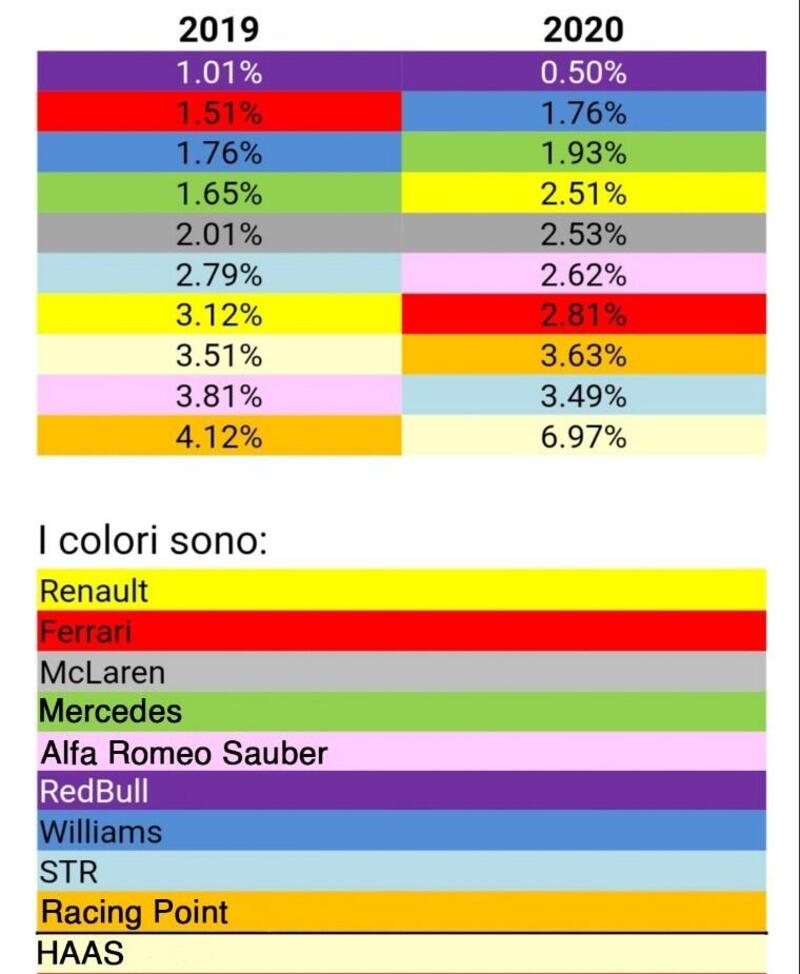 La peggiore nel 2020 è la Haas, che accumula quasi il 7% di ritardo rispetto ai migliori. Ecco la tabella completa con chi sale e chi scende rispetto a un anno fa. La sorpresa è la Williams che da terza forza sale al secondo posto, superando pure la Mercedes ai box, che conserva la terza posizione. Ottima la salita della Renault che da settima sale al quarto posto assoluto. La McLaren si conferma al quinto posto peggiorando di poco rispetto a 12 mesi prima. I miglioramenti li hanno fatti in pista in termini di prestazioni assolute. Precipita la Toro Rosso (attualmente Alpha Tauri) che da sesta diventa nona, poco davanti alla Haas. Ma il tonfo più grande risulta essere la Ferrari: lenta in pista e lenta ai box. L'ombra dell'armata stupenda del tempo che fu.