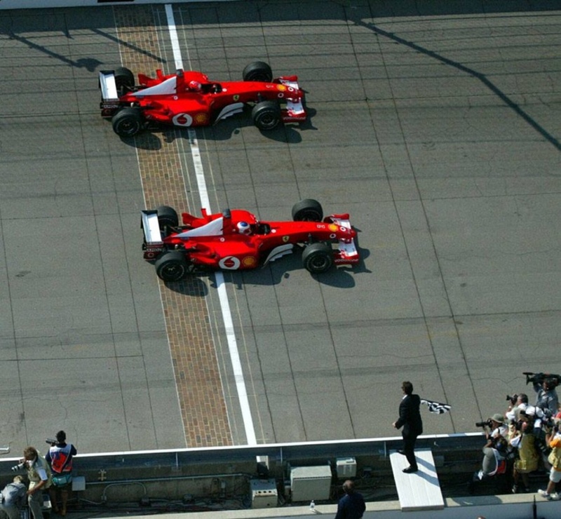 Situazione simile trentacinque anni dopo, fortunatamente sono differenti i presupposti. Nuovamente due Ferrari protagoniste, quelle di Michael Schumacher e Rubens Barrichello. Si corre il gp degli Usa a Indianapolis, in un circuito ricavato all'interno dell'ovale.