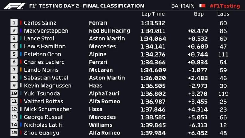 C'è Carlos Sainz al top della classifica del secondo giorno dei test del Bahrain della Formula 1. Lo spagnolo con gomme C4 ha fermato il cronometro sull' 1.33.532 migliorando di quattro decimi il tempo di Giovedì di Pierre Gasly, per poi fare ad un'ora dalla bandiera a scacchi una simulazione gara con un del 1.40 e 1.38 alto con le C3 e C2, Sainz a parità di mescola, ha inflitto un distacco di mezzo secondo al campione del mondo Max Verstappen, con il quale durante il long run è stato protagonista di un corpo a corpo. Terzo è Lance Stroll con la C4 confermando le buone impressioni lasciate dall'Aston Martin già a Barcellona.
