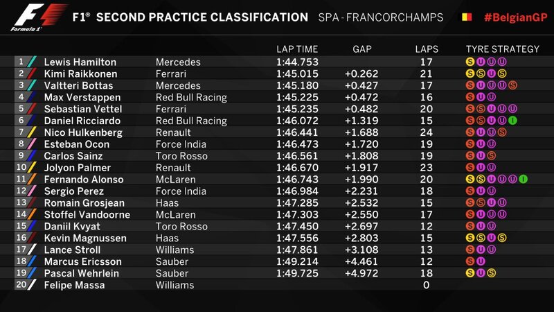 Il venerdì a Spa, tracciato storico vero dei pochi rimasti attivi nel Circus. vede un Lewis Hamilton più veloce nella seconda sessione, quella pomeridiana, unico sotto 1'45" davanti al riconfermato uomo in rosso Kimi Raikkonen, a meno di tre decimi. Le Ferrari soprattutto, grazie ad alcune migliorie tecniche, sembrano andare molto bene in assetto gara, che è quello che conta.
