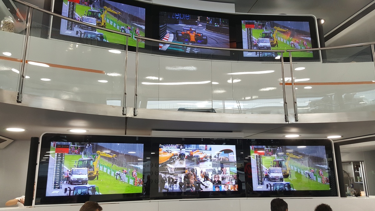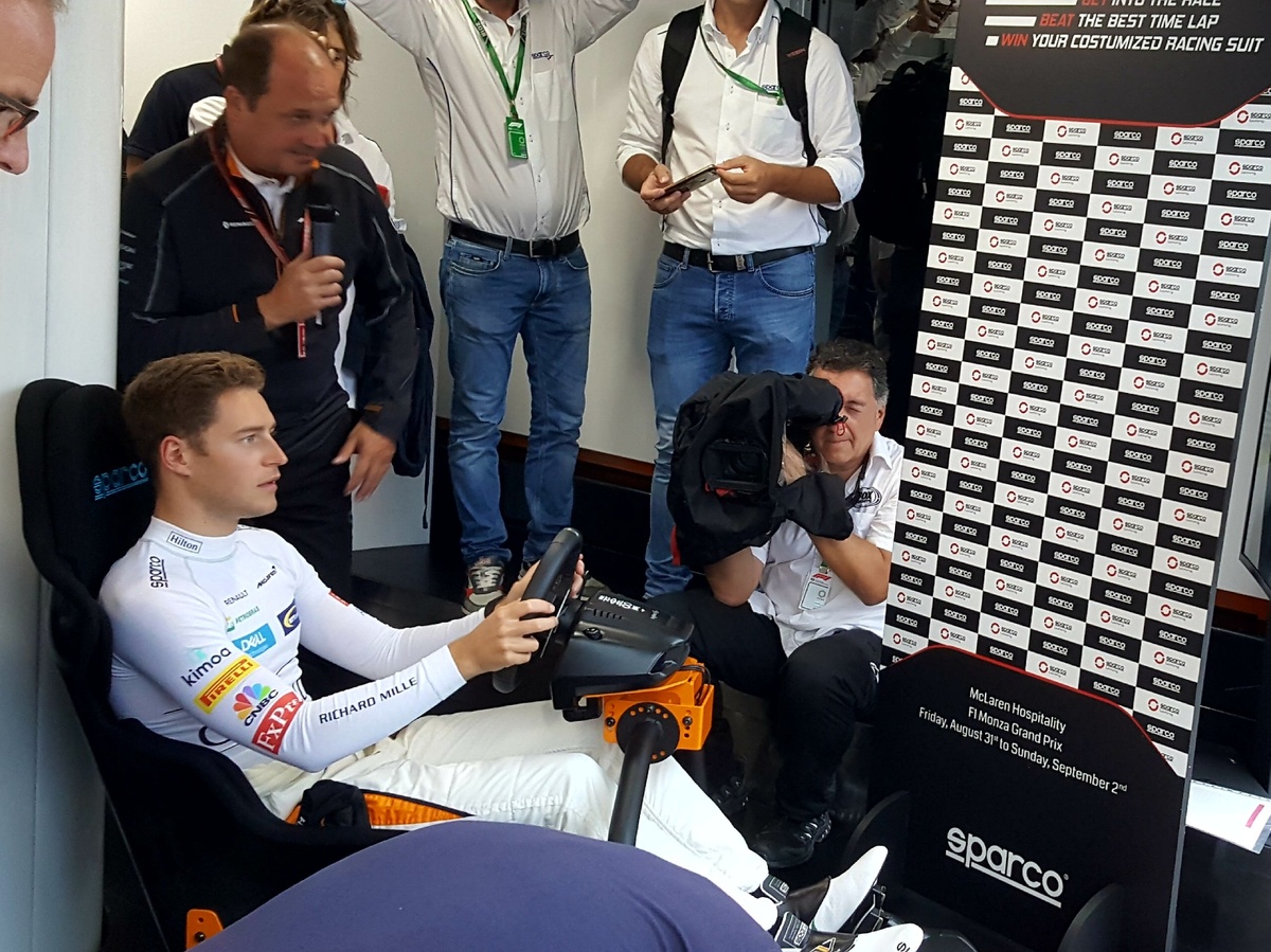 14.15 Nel Motorhome McLaren al simulatore guida con attrezzatura Sparco Stoffel Vandoorne sfida alcuni rappresentanti dei media.