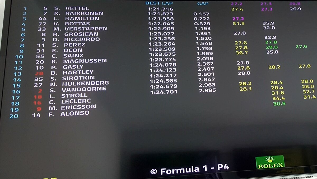Sessione conclusa con le due Ferrari di Vettel e Raikkonen a precedere le Mercedes e poi il resto del mondo, distanziato di oltre un secondo.