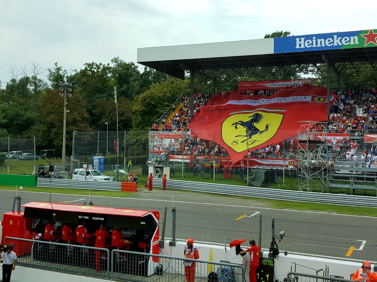 Come tradizione a Monza, davanti al box Ferrari sulla tribuna svetta il cuore rosso con il cavallino. Accade a ogni sessione.