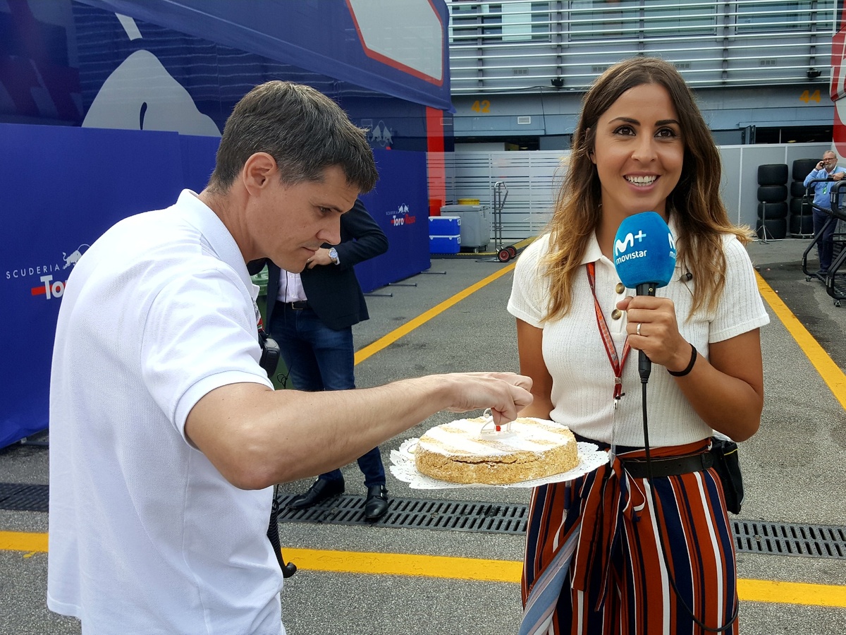 Quelli della TV spagnola attendono con torta e candelina accesa Carlos Sainz per festeggiare il suo 24esimo compleanno.