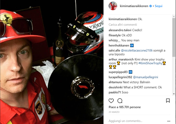 Lo stile ermetico di Raikkonen sorprendentemente si sposa molto bene con i post su Instagram. «I master this selfie thing now too», adesso padroneggio anche questa cosa dei selfie, scrive postando il suo primo autoscatto. Ancora più succinta la descrizione di una sua foto in posa con il trofeo conquistato nel GP d’Australia: «Ok».