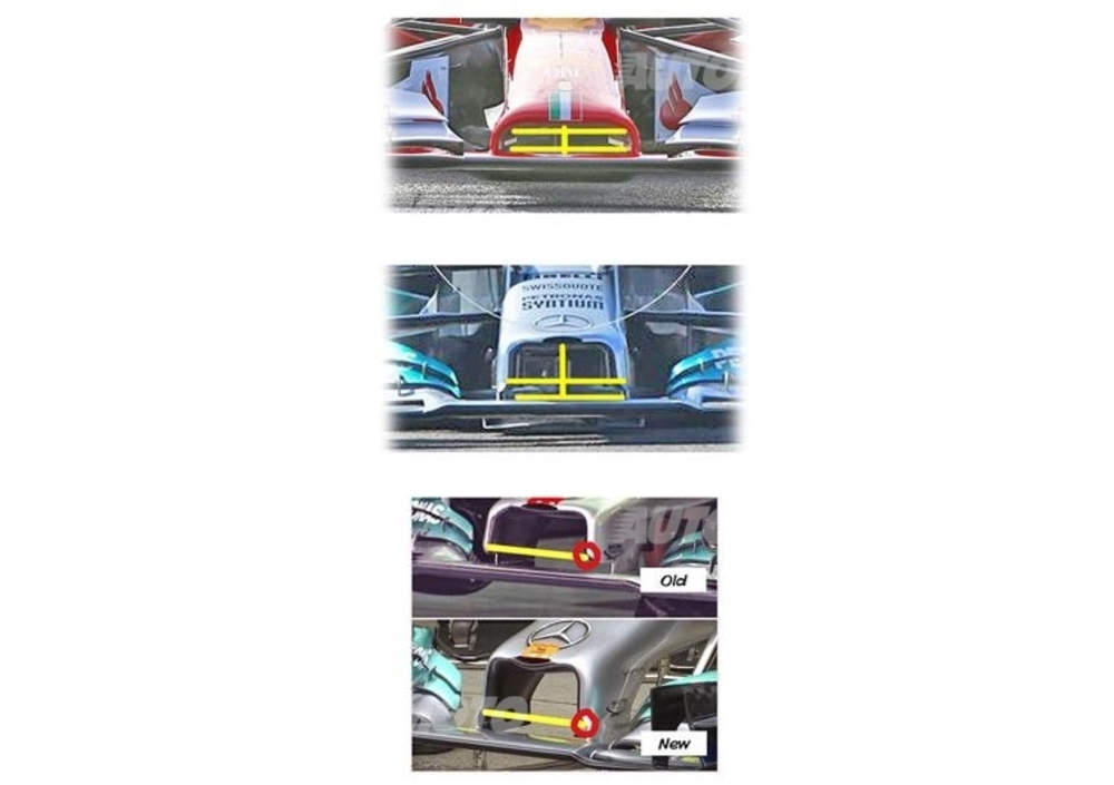 Insomma, secondo le altre squadre, Ferrari compresa (che è l’unica che ha seguito l’idea Mercedes attenendosi però fedelmente al dettame regolamentare) quelli che sono considerati piloni di attacco all’ala per la Mercedes sono solo il prolungamento del musetto.