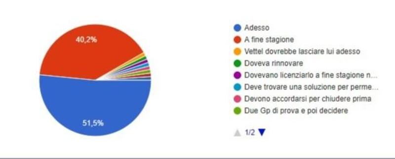 Ebbene, alla domanda se Vettel deve essere licenziato subito oppure finire la stagione, il 51,5 per cento degli interpellati ha detto che deve essere licenziato immediatamente. Quindi porre fine a una annata tribolata in cui pilota e squadra non si trovano. Questo dato diventa ancora più "pesante" di fronte alle altre risposte, ovvero una piccola percentuale ritiene che Vettel dovrebbe lasciare lui la scuderia, siamo sul 2 per cento, altri invece che devono accordarsi per finire prima il rapporto (e siamo su un altro 3 per cento).