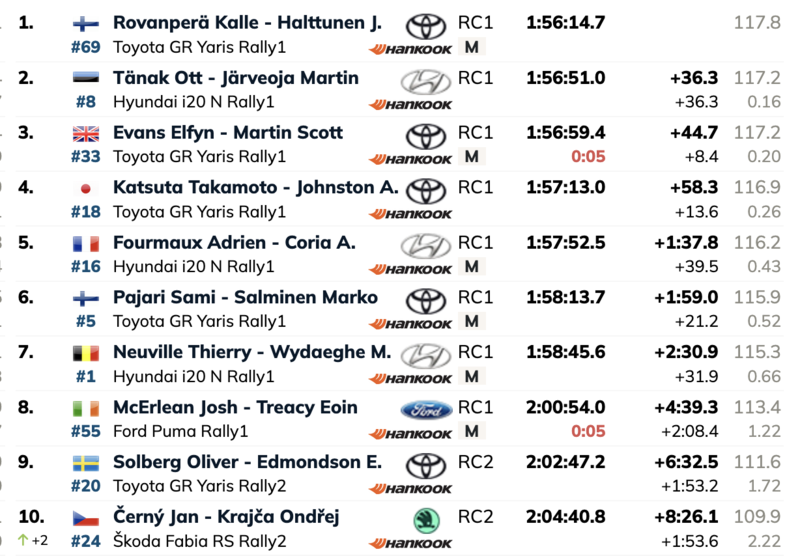 Un attimo prima Rovanpera aveva invertito la tendenza, comunque quasi impercettibilmente. Da un meno sei, decimi, era passato alla bellezza di un più 7, sempre decimi. È la Made in FRG 1, la prima del sabato, la risposta di Rovanpera allo status creatosi venerdì alla chiusura della giornata di gara. Nessun dramma, i due battistrada si scambiano la posizione, le tre Toyota al comando non le tocca nessuno. Decima Speciale, come si è detto, la prima Keply di 21 chilometri. Ha piovuto, lavato, sporcato. Al chilometro 10 il “fattaccio” che sgonfia il pathos incredibile del terzo Central European Rally. Ogier esce di strada e dalla corsa (per il giorno, certo), Rovanpera si ritrova in un'agorafobica prima posizione, 40 secondi lontano da Evans, ora secondo, e Tanak, ora terzo, in testa e in perfetta solitudine.