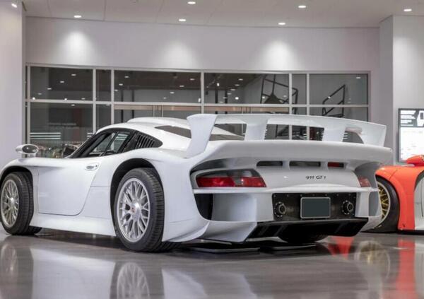 Di Porsche da leccarsi i baffi c’è ne sono parecchie ma suscitano sempre un gran batticuore: a partire dalla 959, la 917, 918 Spyder, Carrera GT, Type 64, 962 e poi lei, una delle più folli vetture che potreste mai trovare su strada, la 996 GT1 Strassenversion. Come suggerisce il nome la vettura venne creata per competere nella classe GT1, che di conseguenza prevedeva la realizzazione di una ventina di versioni stradali. L’esemplare in questione è del ’98 ed è verniciato in Fern White, abbinato a degli interni in pelle totale nera e stupendi cerchi argentati. Con la 996 normale in comune ci sono solamente i fari; a primo impatto l’aspetto è selvaggio proprio come ci si aspetta da una vettura da corsa con un' apertura delle porte verticale, sfoghi e prese d’aria ovunque, un’ala che fa invidia anche alle ultime versioni della GT3 RS e una carrozzeria allargata e allungata per far fluire meglio l’aria.