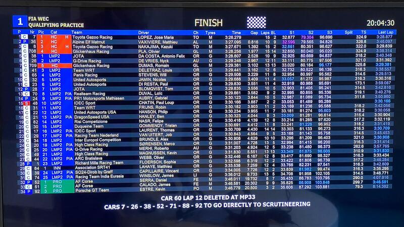 Ad un secondo e quattro dal compagno di squadra Kazuki Nakajima. Dietro al giapponese la Glickenhaus di Oliver Pla 4° davanti all'altra vettura della scuderia americana di Romain Dumas.