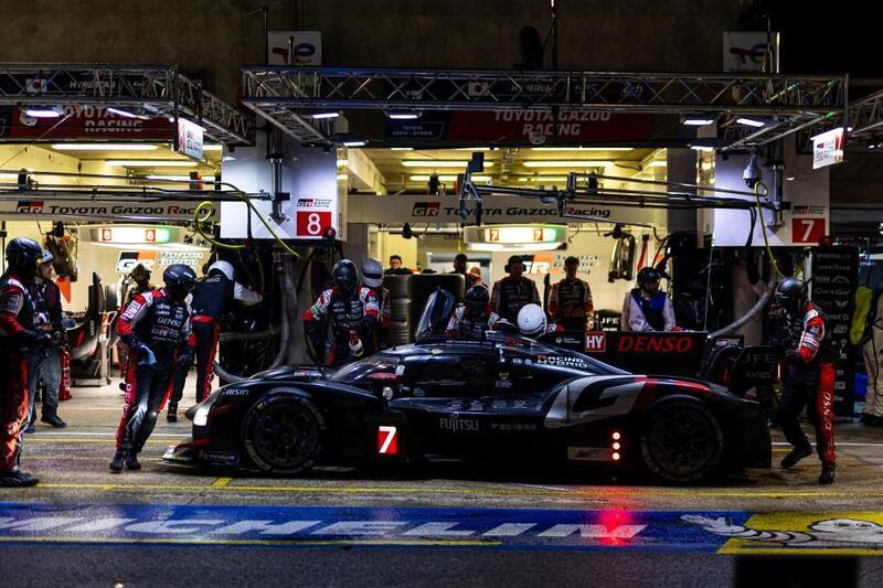 Allo scoccare della mezzanotte, il cielo nuvoloso si è illuminato grazie allo spettacolo pirotecnico, oltre alle luci del concerto dei Simple Minds. Nel mentre, il gruppo di giornalisti invitato da Toyota, di cui noi facciamo parte, ha avuto la possibilità di entrare nel cuore pulsante di questa 24 Ore, ovvero i box, dove si concentra la vera magia che rende unico l'appuntamento di Le Mans. Indossiamo le cuffie ed iniziamo il garage tour. Alettoni posteriori, pezzi di ricambio e gomme riempiono lo spazio antestante la zona box. I meccanici lavorano alle gomme misurandone la pressione e preparando i treni che verranno utilizzati dalla GR010 numero #7 ed #8. Le mescole scelte sono le soft e le medium - come ci hanno spiegato - per via della facilità di messa in temperatura rispetto alle hard dato il clima freddo e il divieto della FIA di utilizzare le termocoperte per ridurre l'impatto ambientale. L'arrivo della pioggia ha ovviamente obbligato tutti i team ad optare per le gomme da bagnato ed è qui che viene fuori la vera strategia. Fare il pit stop al momento giusto, non solo per rifornire, ma per passare alle slick appena la pista va ad asciugarsi per avere più trazione e maggiore velocità. Al piano di sopra, oltre alla zona catering dove i meccanici possono spizzicare qualcosa nel corso della notte, si trova una saletta dedicata agli ingegneri dove vengono analizzati tutti i dati e le telemetrie. Qui vengono svolti anche i breefing con i piloti che arrivano nel box circa un'ora prima l'inizio del loro stint. Infatti, prima di darsi il cambio e tornare al volante, possono andare nei loro motorhome o nelle stanzette a loro dedicate nell'hospitality per riposare, mangiare e farsi una doccia. Quando vengono richiamati dal team, passano prima a colloquio dagli ingegneri e poi si preparano a tornare in pista, indossando tute, balaclava e caschi. Si torna poi al piano di sotto, dove si accede al vero e proprio box dove i meccanici riposano tra un pit stop e l'altro.