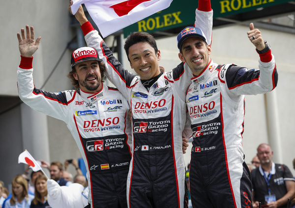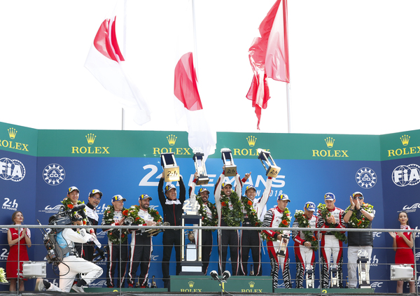 Era ora che un grande costruttore che si impegna nella massima formula automobilistica a ruote coperte, con tecnologia di primo livello e sforzi decennali, ottenesse il massimo risultato. La 24 ore di Le Mans è più di un terno al lotto e anche per quello vincerla vale tanto, per chi realizza la vettura prima al traguardo. Toyota quest’anno piazza addirittura le prime due e meritatamente, dominando dall’inizio alla fine. L’ultimo successo della tecnologia giapponese risale ai primi anni Novanta, con Mazda. Oggi è l’idolo della F1 spagnolo Alonso ad accompagnare i compagni Nakajima e Buemi sul gradino più alto del podio più ambito, quello dove conta prima il mezzo dei piloti. Per le vetture GTE non si smentisce però il dominio tedesco, con Porsche che ben festaggia il proprio 70esimo.