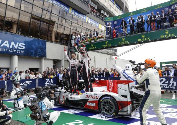 15.00 Le Toyota vincono in parata la 24 ore di Le Mans 2018. Trionfo giapponese in tutti i sensi, con Nakajima davanti a Kobayashi.