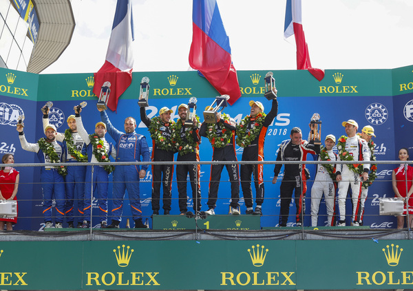 15.10 I podi delle quattro categorie, con la Pink Pig Porsche prima in GTE-Pro