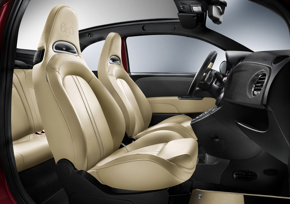 Aperta la portiera si possono notare i sedili realizzati interamente in pelle Poltrona Frau di colore beige sabbia, con fasce di contenimento con imbottiture in monoportanza, e una serie di particolari stilistici, come la scritta “695” riportata con termoimpressione sul poggiatesta o l'elettrosaldatura a contrasto di colore grigio pista intonata alla carrozzeria.