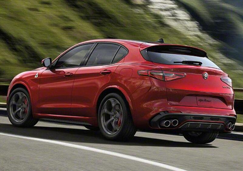 Stelvio Quadrifoglio, la versione top di gamma presentata a Los Angeles, vanta una minigonna in tinta tinta carrozzeria impreziosita da un'appendice in carbonio che ne accentua ulteriormente la sportività. Questo elemento, insieme ai paraurti anteriore e posteriore e ai possenti archi passaruota, rendono Stelvio Quadrifoglio più simile ad una berlina sportiva che a un tradizionale SUV di questo segmento. La vettura sembra quasi muscolosa sulla fiancata, grazie ai forti contrasti tra le superfici che prendono luce e quelle che rimangono in ombra.