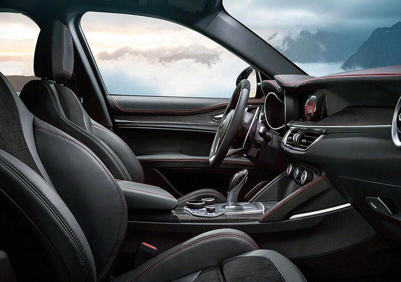 Negli interni della versione Quadrifoglio presentata a Los Angeles spiccano materiali leggeri come carbonio e Alcantara, che sottolineano il carattere sportivo della vettura. Il volante vanta un inserto in Alcantara nera con cuciture a vista in colore rosso nella parte alta. Il posto di guida è stato cucito come un abito, con materiali pregiati - oltre all'Alcantara, fibra di carbonio e legno - assemblati con cura.