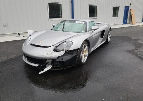 La Carrera GT inserzionata dalla case d’aste americana, Copart, è venduta ovviamente come incidentata, dato che il frontale ha subito un impatto piuttosto notevole che però non sembra aver causato danni irreparabili: il paraurti anteriore è danneggiato, così come il faro sinistro, ma ciò che lascia perplessi è la sola esplosione dell’airbag del passeggero.