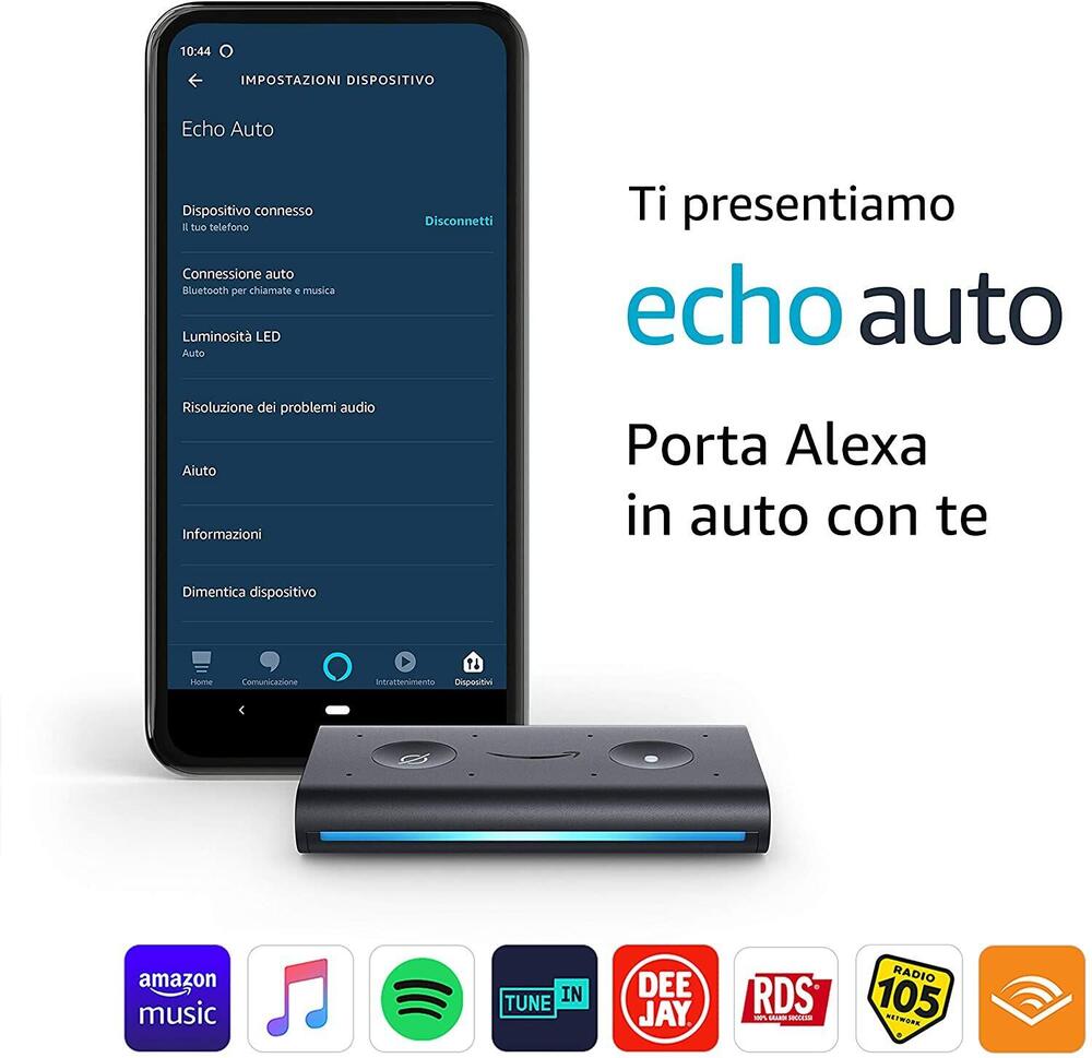 Echo Auto è alimentato dai 12V o dalla porta USB presenti in vettura e si connette all’impianto stereo attraverso un cavo audio (jack 3,5mm) o Bluetooth. Si connette ad Alexa attraverso l’app Alexa sul proprio smartphone e utilizza, per la connessione, il piano dati già esistente.