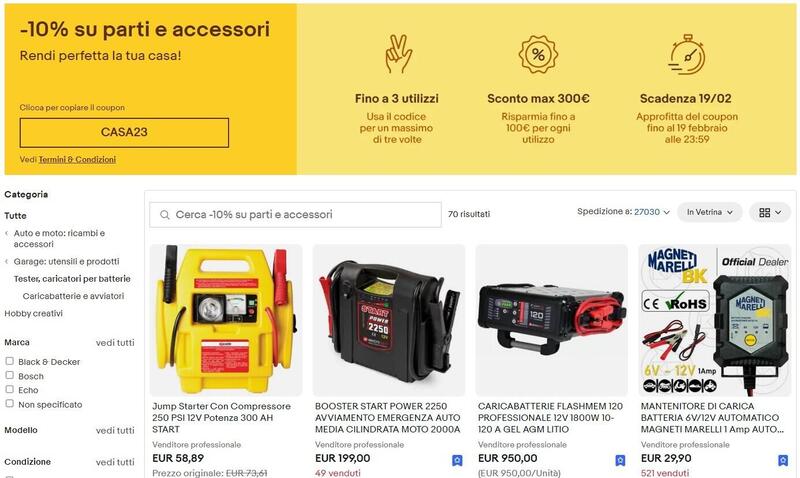 Ottenere questo bonus sugli acquisti è semplice come non mai, e non va dimenticato che restano valide tutte le garanzie che l'acquisto su eBay riserva agli acquirenti. Il periodo di validità è dal 23 gennaio e fino alle 23:59 del 19 febbraio. Per conoscere i dettagli dell'offerta, che si estende anche a molti alti beni disponibili su eBay, basta andare nella pagina dedicata e osservare bene quel che compare nei menù della colonna a sinistra; ricambi, tuning, olii e lubrificanti. Su questi prodotti si piò ricevere direttamente al momento del pagamento uno sconto del 10% fino a un massimo di 100 euro per singolo coupon, e la spesa minima singola è pari a 20 euro. C'è un altra regola: siccome ogni utente può utilizzare tre volte il coupon, lo sconto massimo totale è di 300 euro. Questa promozione che si aggiunge alla nota sicurezza scaturente della piattaforma eBay e della Garanzia cliente eBay e che vi toglie ogni preoccupazione su pagamenti, restituzioni e affidabilità di venditori e compratori, una caratteristica esclusiva di eBay. Non siete degli esperti di ricambi e accessori? Anche in questo caso eBay vi viene incontro con la possibilità di scegliere inserendo la marca e il modello della vostra auto, con la certezza di non sbagliare. La promozione coupon del 10% è valida se si paga con carta di credito o Paypal.