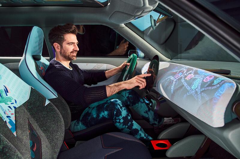 Passando poi all’interno, l’occhio cade inevitabilmente su una delle icone del design sin dai tempi di Sir Alec Issigonis, ovvero il grande strumento circolare a centro plancia. Uno schermo Oled ad alta definizione che offre uno spazio di visualizzazione delle informazioni inconsueto ma vasto e ben leggibile. Ma in realtà, attraverso varie modalità di proiezione, tutto il cruscotto e persino i rivestimenti delle porte sono investiti da flussi luminosi decorativi. A “fare tappezzeria” ci sono stoffe tecniche multicolor dal design quasi spudorato ma piacevolmente chiassoso, quasi una festa arcobaleno per sedili, cinture e volante, con la razza inferiore realizzata con un nastro colorato.