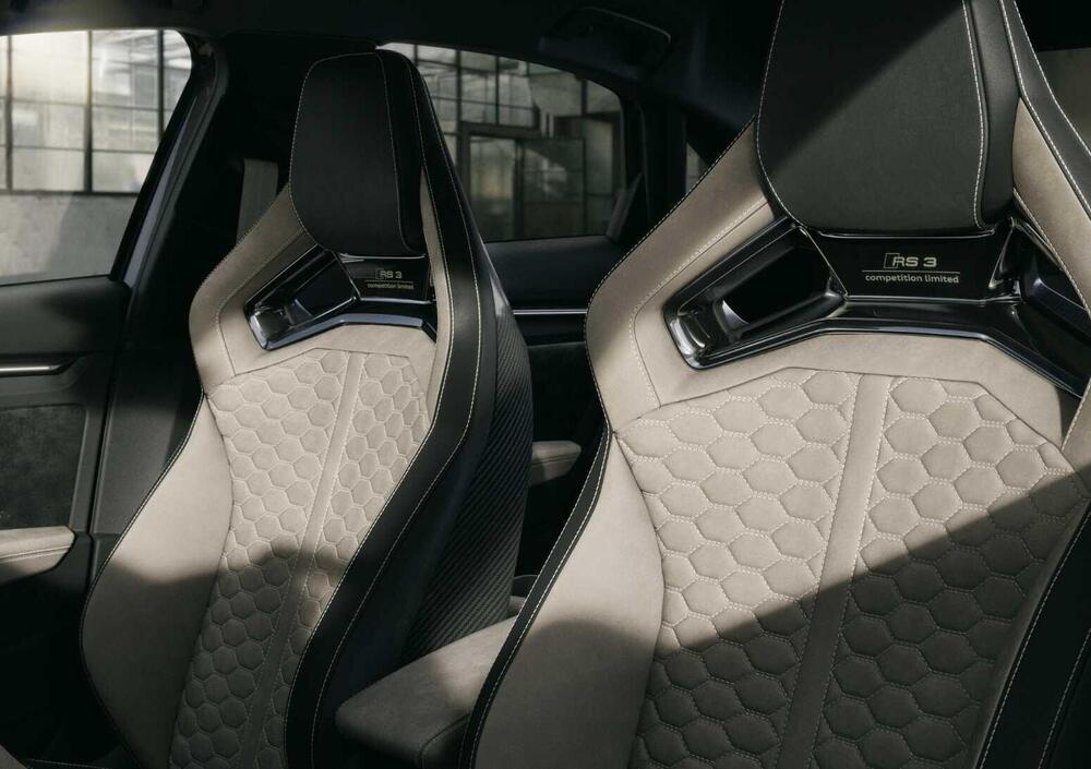 L'illuminazione alla base delle portiere proietta a terra la scritta RS 3 competition limited. I sedili anteriori a guscio, in carbonio opaco, hanno rivestimento in pelle nera con sezioni centrali in microfibra nella tonalità oro neodimio. Sul tunnel centrale, una targhetta numerata a finitura opaca riporta il numero di serie del singolo esemplare. Uno su 750.