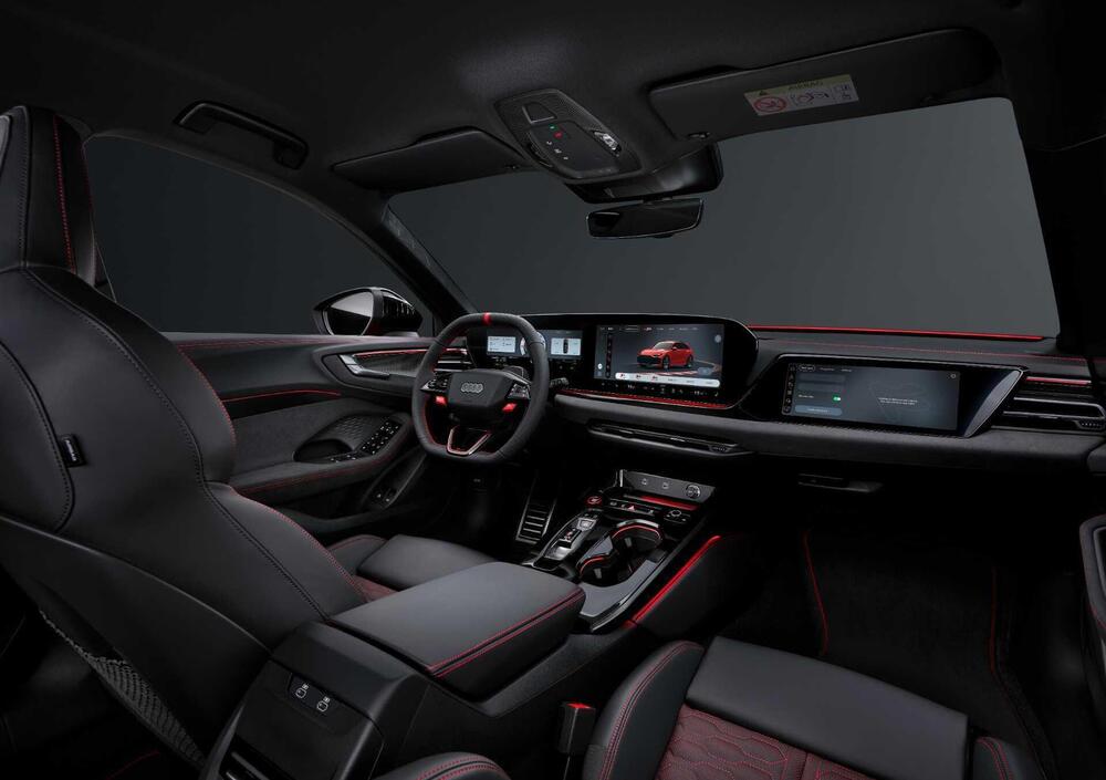 L'abitacolo della RS 5 è uno spazio che bilancia l'ambizione sportiva con la realtà di una daily car. Appena si entra, la scena dell'abitacolo viene dominata dal Panorama display: una struttura curva e a sbalzo che unisce l'Audi virtual cockpit da 11,9 pollici e il display MMI touch da 14,5 pollici in OLED, affiancati da un terzo display da 10,9 pollici per il passeggero che può essere usato per la navigazione condivisa, per i contenuti multimediali o per funzioni di infotainment indipendenti.
