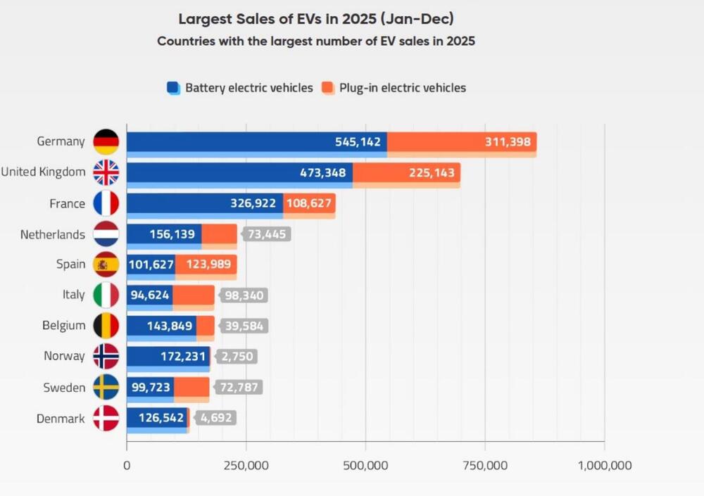 Il primato per numero assoluto di vendite EV in Europa spetta alla Germania: 856.540 veicoli elettrificati nel 2025, con un balzo del 49,61% sul 2024. Nel dettaglio, le BEV (auto 100% elettriche) sono salite a 545.142 unità (+43,23%), mentre le plug-in hybrid (PHEV) hanno fatto segnare un'impennata del 62,27%, arrivando a 311.398 unità.