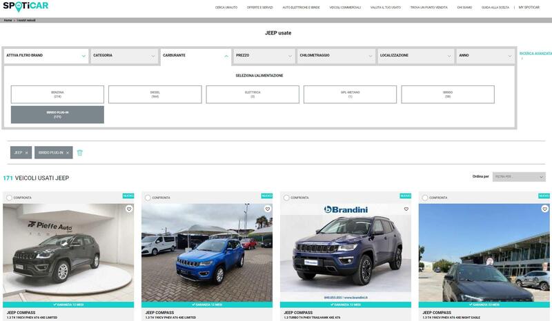 Attualmente Spoticar propone disponibili all’acquisto in Italia un centinaio Jeep Compass ibride, con prezzi esposti da circa 30.000 euro e una “freschezza garantita”: per anno produzione molto recente, con chilometraggi contenuti (poche decine di migliaia di Km, se non Km zero).