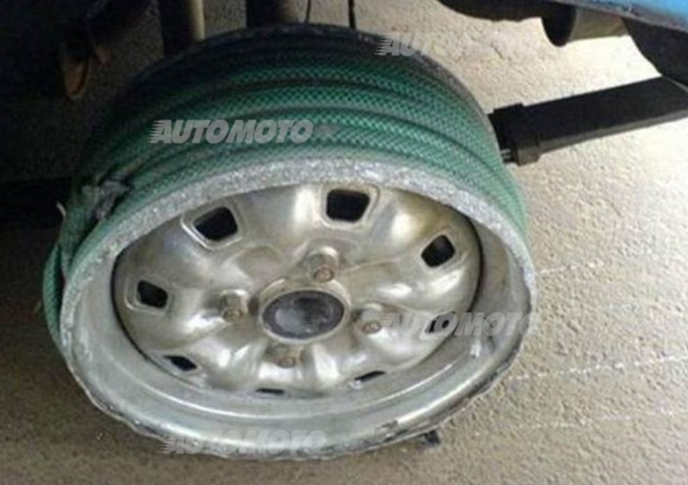 Il secondo gradino più alto del podio lo guadagna questo automobilista, con ogni probabilità un responsabile nel reparto Ricerca&Sviluppo di qualche grande costruttore di pneumatici. Se hai bucato e non hai la gomma di scorta basta qualche metro di tubo per innaffiare il giardino. La rumorosità durante il rotolamento è notevole, in frenata si va lunghi e in curva si rischia il frontale, ma è un ottimo esempio di riciclaggio creativo.