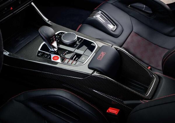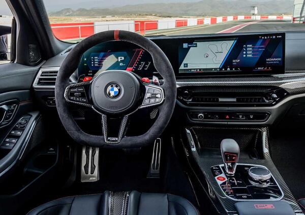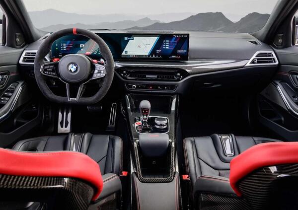 La BMW M3 CS Touring sfoggia un design più aggressivo, con la griglia a doppio rene M senza cornice e la scritta del modello in nero con contorno rosso. L’abitacolo riprende quello della M3 Touring, con sedili M Carbon regolabili elettricamente e riscaldati, volante M in Alcantara e finiture in fibra di carbonio. Il sistema infotainment è affidato al BMW Curved Display, che integra due schermi: 12,3 pollici per la strumentazione e 14,9 pollici per il sistema multimediale con piattaforma iDrive 8.5.