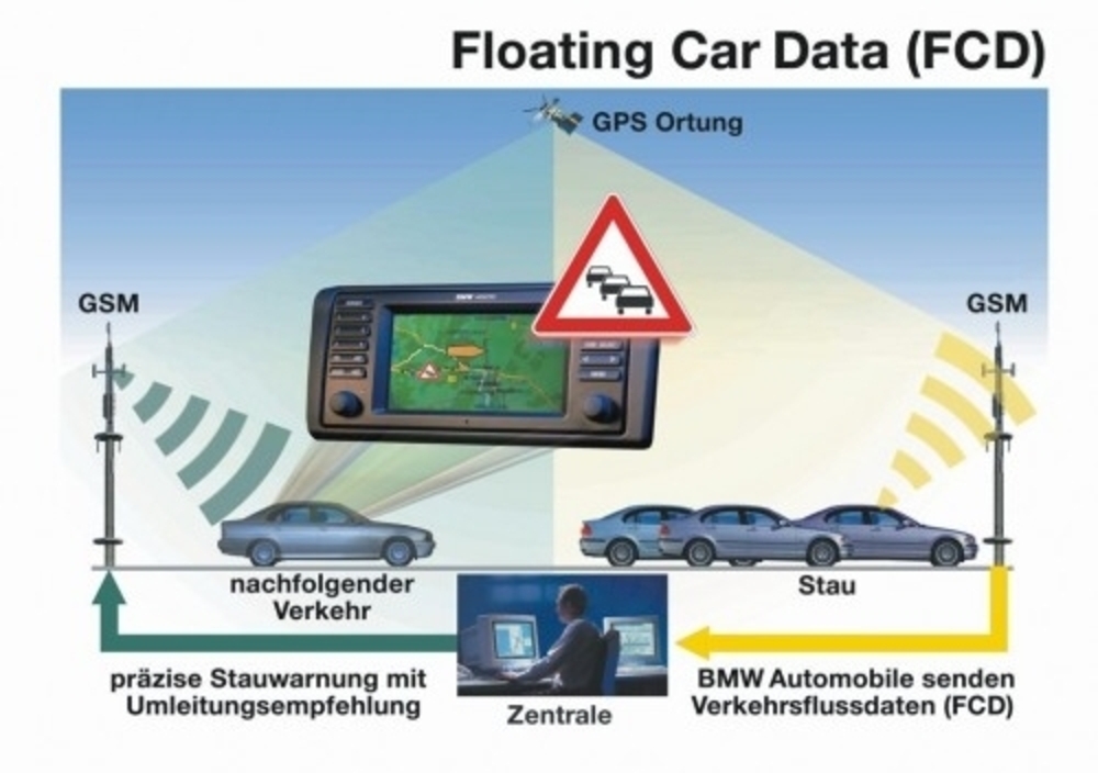 La soluzione del Gruppo BMW è rappresentata dalla tecnologia “Floating Car”, o per brevità FCD (Floating Car Data). Come suggerisce il nome, i “Floating Cars” sono veicoli che “fluttuano” nel traffico e funzionano da sensori mobili. Questi veicoli sono equipaggiati di un ricevitore GPS e di un’apparecchiatura di radiocomunicazione che ne determina in ogni momento la posizione, e trasmette questa informazione e i tempi di spostamento come dati anonimi al Centro di Controllo del Traffico, dove essi vengono confrontati con quelli ricevuti da altri veicoli, per identificare eventuali congestioni di traffico.