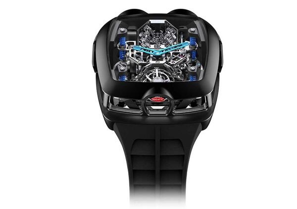 Il motore W16 in miniatura è incastonato sotto un vetro zaffiro ed è sospeso dalla cassa grazie a quattro ammortizzatori; sono visibili i movimenti delle turbine, dell'albero e dei pistoni, funzionanti come quelli del W16 della Chiron. Risultato di oltre un anno di ricerca e assemblamento, Bugatti Chiron Tourbillon consta di 578 pezzi interni, racchiusi in una cassa in titanio con finitura brunita, delle dimensioni di 5,4 per 4,4 centimetri. Il cinturino è realizzato in gomma, con fibbia in titanio.