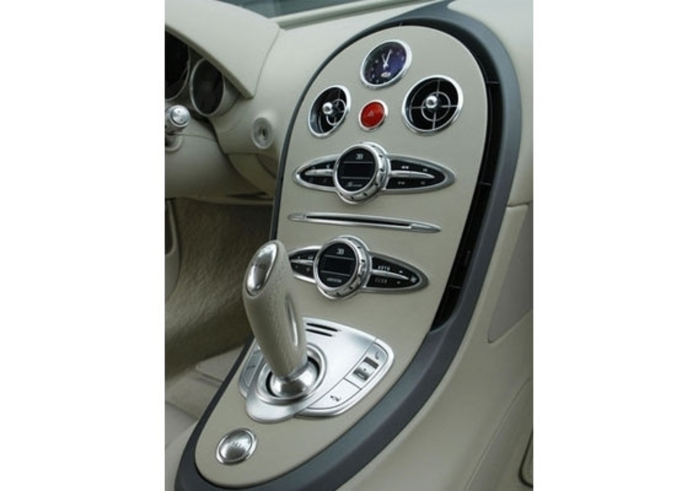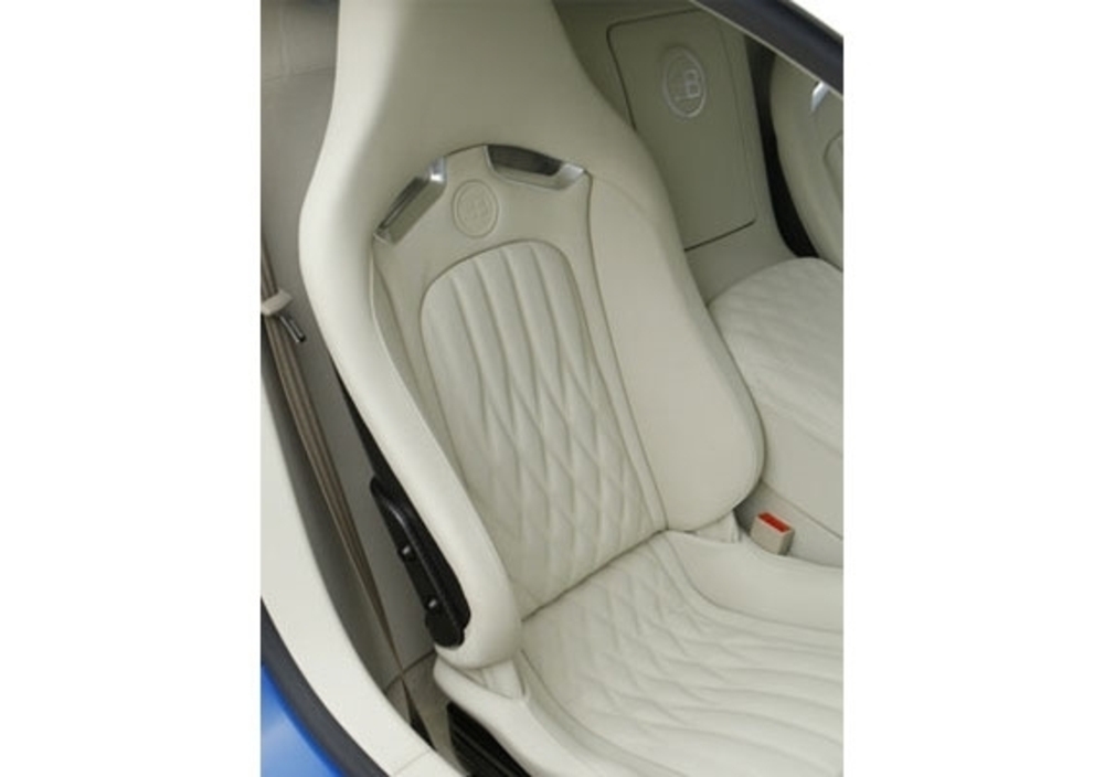Gli interni della Bugatti Veyron Bleu Centenaire sono rivestiti di pregiatissima pelle, in netto contrasto con la tinta esterna: domina un beige chiaro, con cucitura trapuntata.