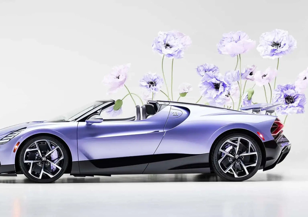 Elemento distintivo è l’ala posteriore retrattile, trasformata in una vera tela artistica con decorazioni floreali dipinte a mano in tonalità iris e lilla, al cui centro compare la firma “Caroline”. Il complesso processo di verniciatura stratificata dimostra il livello quasi sartoriale raggiunto dal reparto Sur Mesure Bugatti. Anche la parte inferiore della vettura utilizza fibra di carbonio “Violet Carbon” a vista, creando un contrasto visivo sofisticato tra aggressività tecnica e delicatezza estetica.