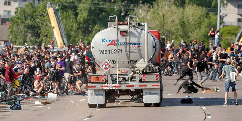 Tra le molte vicende di strada che vive l'America in questo periodo, anche quella del video in oggetto. Durante i momenti più caldi delle proteste globali dopo la morte di George Floyd, dalle parti di Minneapolis, un grande mezzo commerciale, auto cisterna, si trova a passare tra la folla.