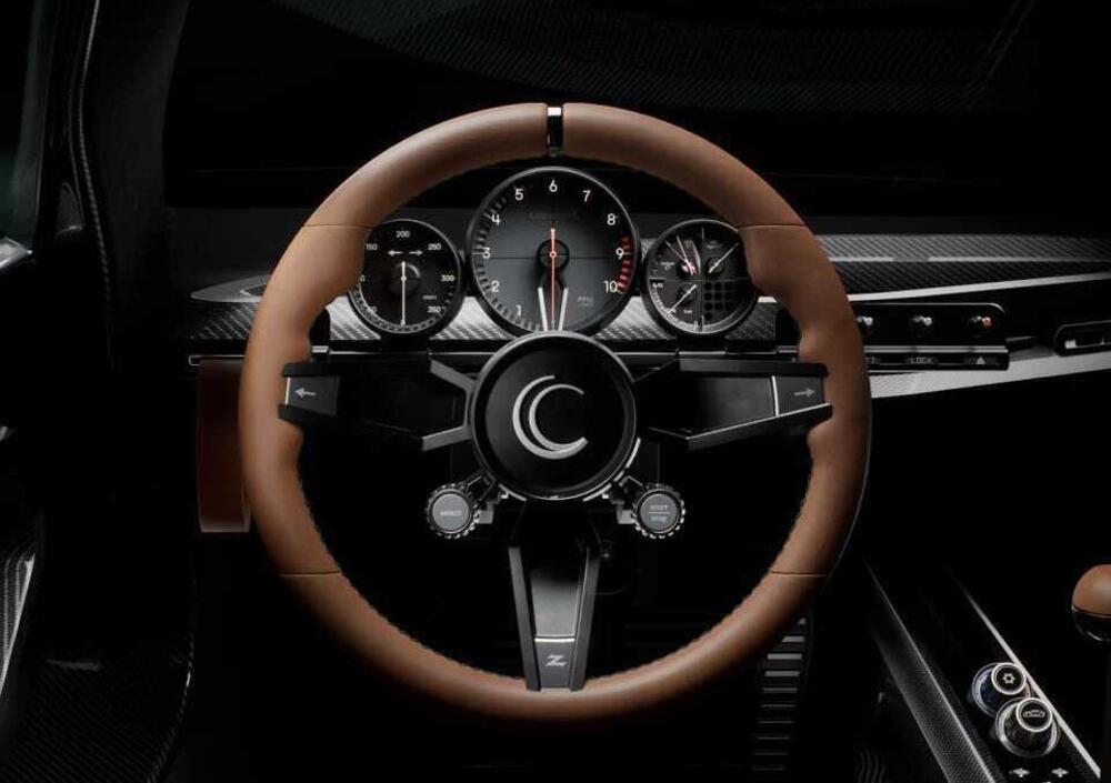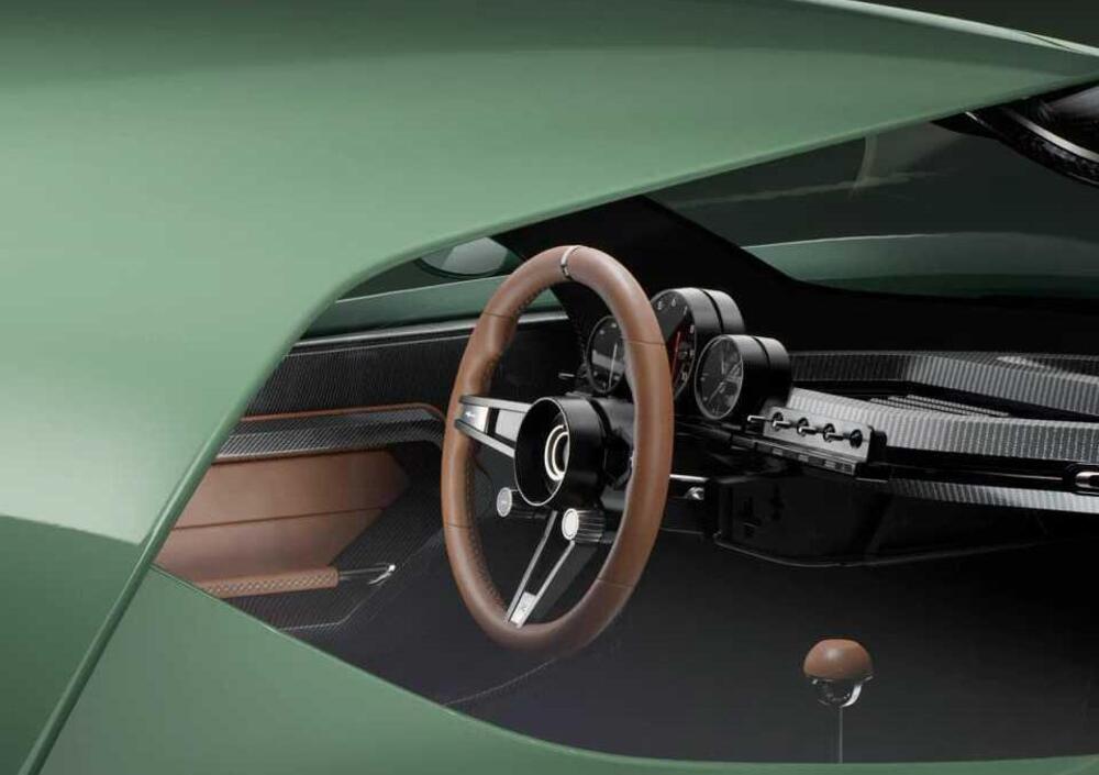 Gli interni sono un omaggio alle corse di un tempo: il contagiri analogico gigante domina il quadro strumenti, mentre velocità, temperatura dell’olio e carburante sono visualizzate con strumenti analogici separati, come sulle vetture da corsa storiche. Le porte ad ali di gabbiano consentono l’accesso a sedili fissati al telaio, regolabili longitudinalmente, e alla leva del cambio, anch’essa regolabile fino a 80 mm per trovare la posizione di guida perfetta. Le modalità di guida – Comfort, Sport e Pista – si selezionano manualmente tramite una manopola sul volante, mentre il piccolo display per la retromarcia rimane l’unico elemento digitale. Qui conta solo la guida, la strada e il motore che risponde, senza distrazioni.
