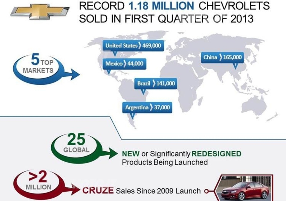 Nel primo trimestre 2013 Chevrolet ha venduto oltre 1,18 milioni di veicoli nel mondo, stabilendo così il decimo record trimestrale consecutivo di vendite globali. Questo risultato è stato possibile anche grazie a prodotti come la compatta Cruze che ha recentemente superato i 2 milioni di vendite globali dal lancio nel 2009.