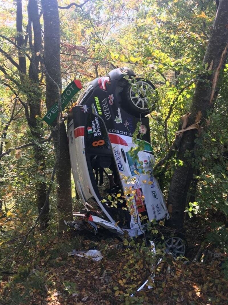 Pronti via. Prima Erbezzo, ventidue chilometri di curve in quota. Bella è dir poco. Poche curve appena, Scandola, Andreuccci… si sgranano gli Equipaggi in ordine di situazione dell’Italiano. Campedelli passa molto bene, Pollara, che ha vinto lo Shakedown del mattino, benissimo. Ma non dura. A Campedelli si ferma la Fiesta powered by M-Sport, Pollara finisce con la seconda Peugeot Ufficiale distrutta e incastrata tra rocce e alberi. La Speciale è fermata, chiaro, il padre di Marco entra in senso contrario spaventato. Le radio rimbalzano gli estremi di un dramma, che poi per fortuna si diluisce in un brutto spavento. La 208 T16 è distrutta e in quella posizione così innaturale evoca l’incidente dell’anno del WRC. Pollara finisce in ospedale, una brutta lacerazione al volto, ma secondo il chirurgo plastico non diventerà lo Scarface di Prizzi. Lo tengono in osservazione di rito, lui e Giuseppe Princiotto che ha preso una gran botta. Di Campedelli non si sa nulla, ovvero non si sente niente perché l’incidente di Pollara “copre” il guasto della Ford. Poi, più tardi, arriva un tizio al Parco Assistenza. “Abbiamo avuto una gran sfiga…” Chi, che cosa? “Sì, sì, una sfiga incredibile non sappiamo come ci sia potuto succedere…” Non è pilota, non navigatore, non necessariamente un tifoso o un appassionato, ha insegne di mestiere sul giubbotto, ma nessuna veramente indicativa. Ma chi sei, di chi parli? Alla fine si “sbottona”. Campedelli… centralina. “E pensare che quel motore viene dall’Inghilterra…” Sa tutto lui. Insomma un problema, un guasto, Campedelli incolpevole. Ma fuori. Il suo Campionato Italiano finisce qui. Fine della partecipazione allo “scozzo” finale. Se la vedono Scandola, Andreucci e Crugnola.