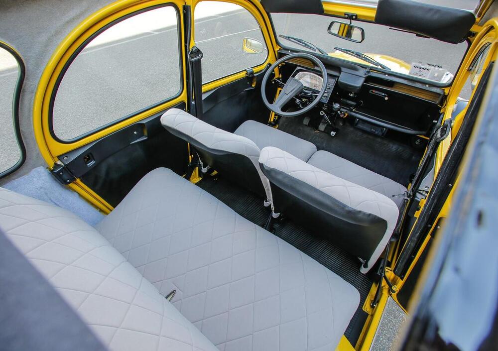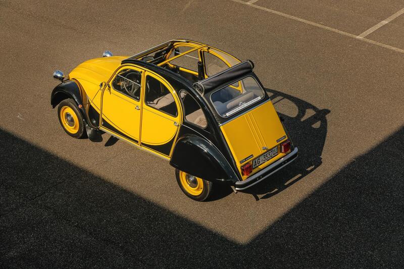 Mi accompagna. È una 2CV6 Special, la prima, l’unica nuova di zecca, Giallo Rialto, sedili neri e cappotte fumo. Lucidata! Ho due optional dei tre disponibili, il posacenere e il portellone posteriore. Significa che, invece di aprirsi al di sotto della modanatura di separazione, portellone e lunotto, che è affogato nella tela, sono resi solidali da un semplice telaio in tubi, e il tutto si apre così “incernierato” sopra il vetro. Non ho il telaietto che consente di aprire solo la parte anteriore del tettuccio in tela, che posso quindi arrotolare integralmente fino al lunotto o soltanto fino a metà del cielo. In omaggio i tappetini logo ufficiali.