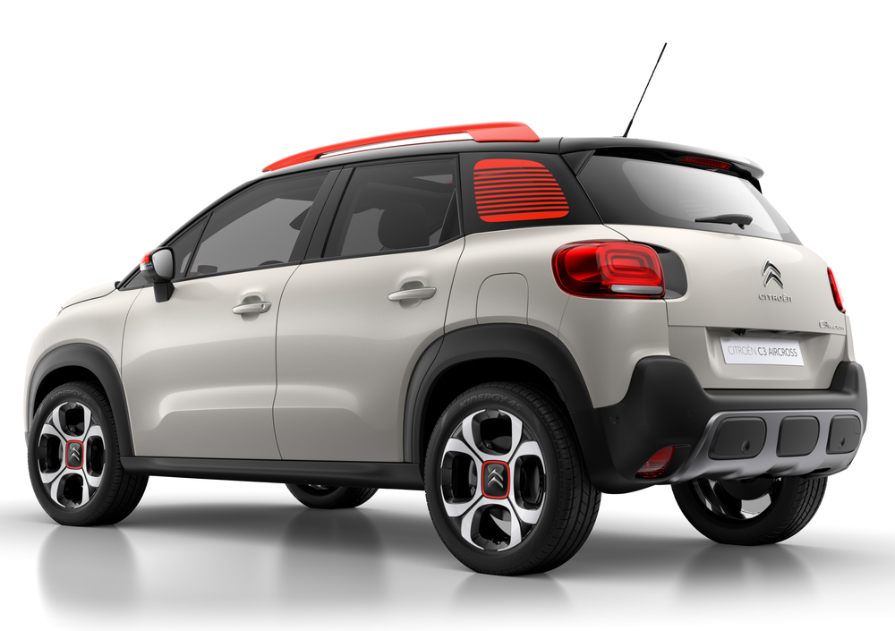 Citroen ha svelato il suo nuovo SUV compatto, C3 Aircross. Lunga 4,15, larga 1,76 e alta 1,64, C3 Aircross vanta un passo di 2,6 metri. Esternamente si fa notare il fascione posteriore, dotato di una parte in plastica nera volta ad attutire i piccoli urti. Spiccano, poi, gli stessi “cuscinetti” già visti sulla C4 Cactus. Curiosa la decalcomania che copre la terza luce posteriore.